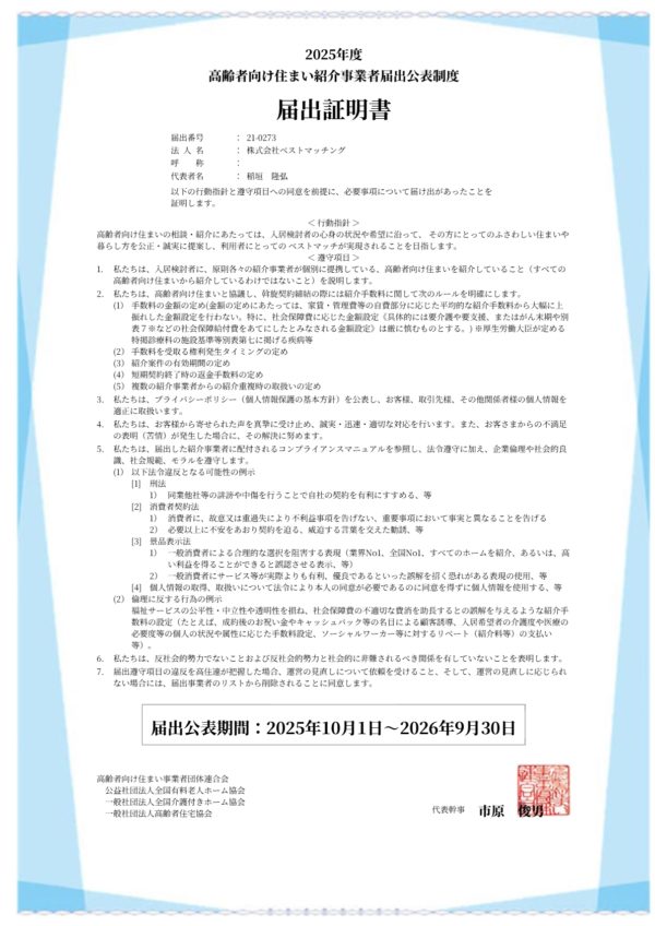 当社が加入している一般社団法人 日本シニア住宅相談員協会が定めた基準をクリアし、「優良な入居相談窓口」として正式に認定を受けました。